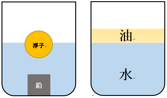 比重が異なることで起こる現象とは、ある液体に対し、投入する物体または液体の比重が小さければ浮き、大きければ沈むということです。