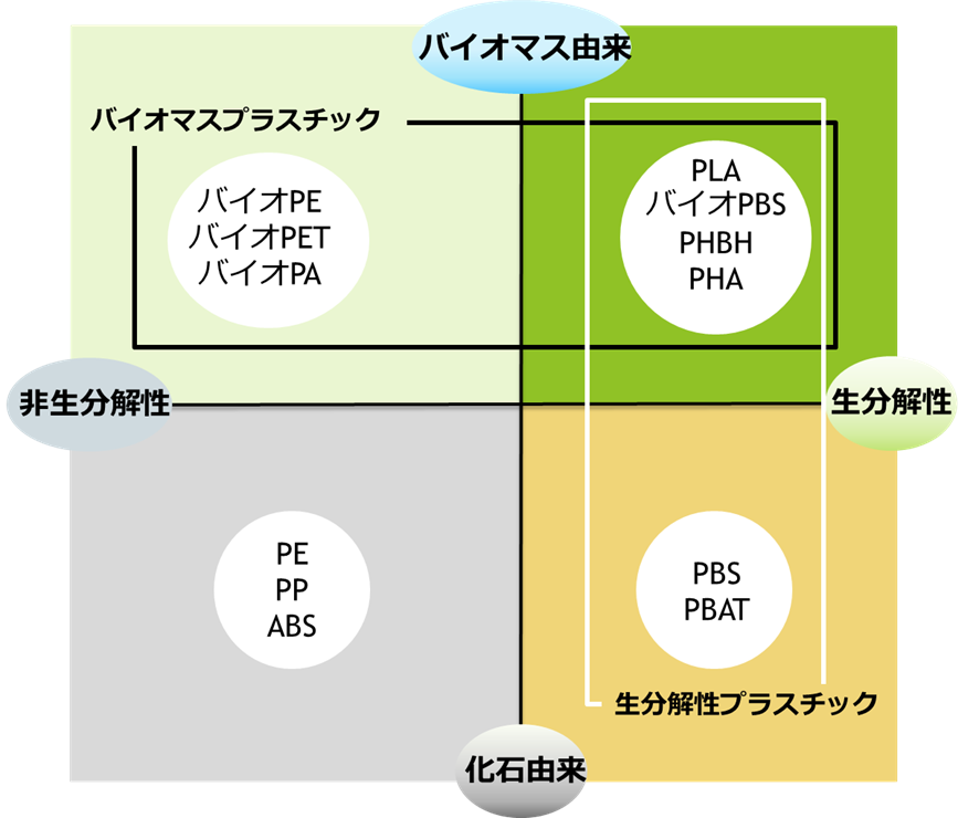 「バイオマスプラスチック」と、「生分解性プラスチック」の総称をバイオプラスチックとよんでいます。