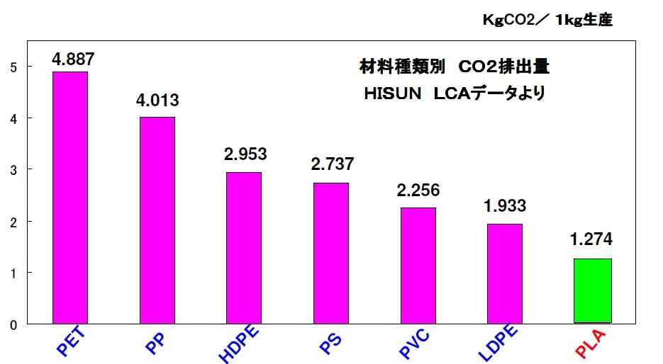 PLA(ポリ乳酸)は非可食のトウモロコシなどを原料とする高分子材料で、従来の化石由来原料と比較して大きくCO2の排出を抑制できます。