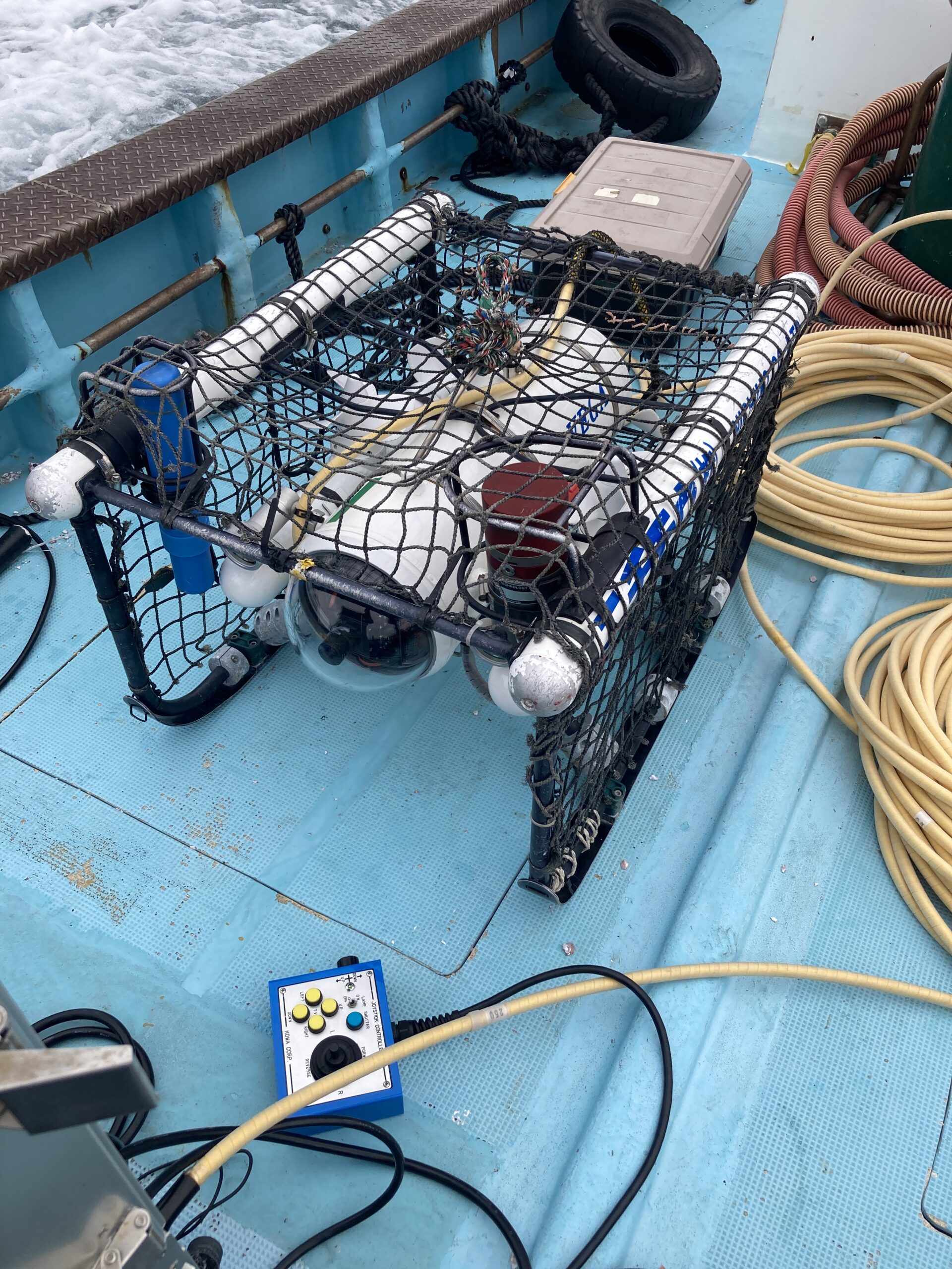 本体はカメラがついた大型のラジコンのような潜水艇となっており、海中の映像を船上でリアルタイムに確認することができます。