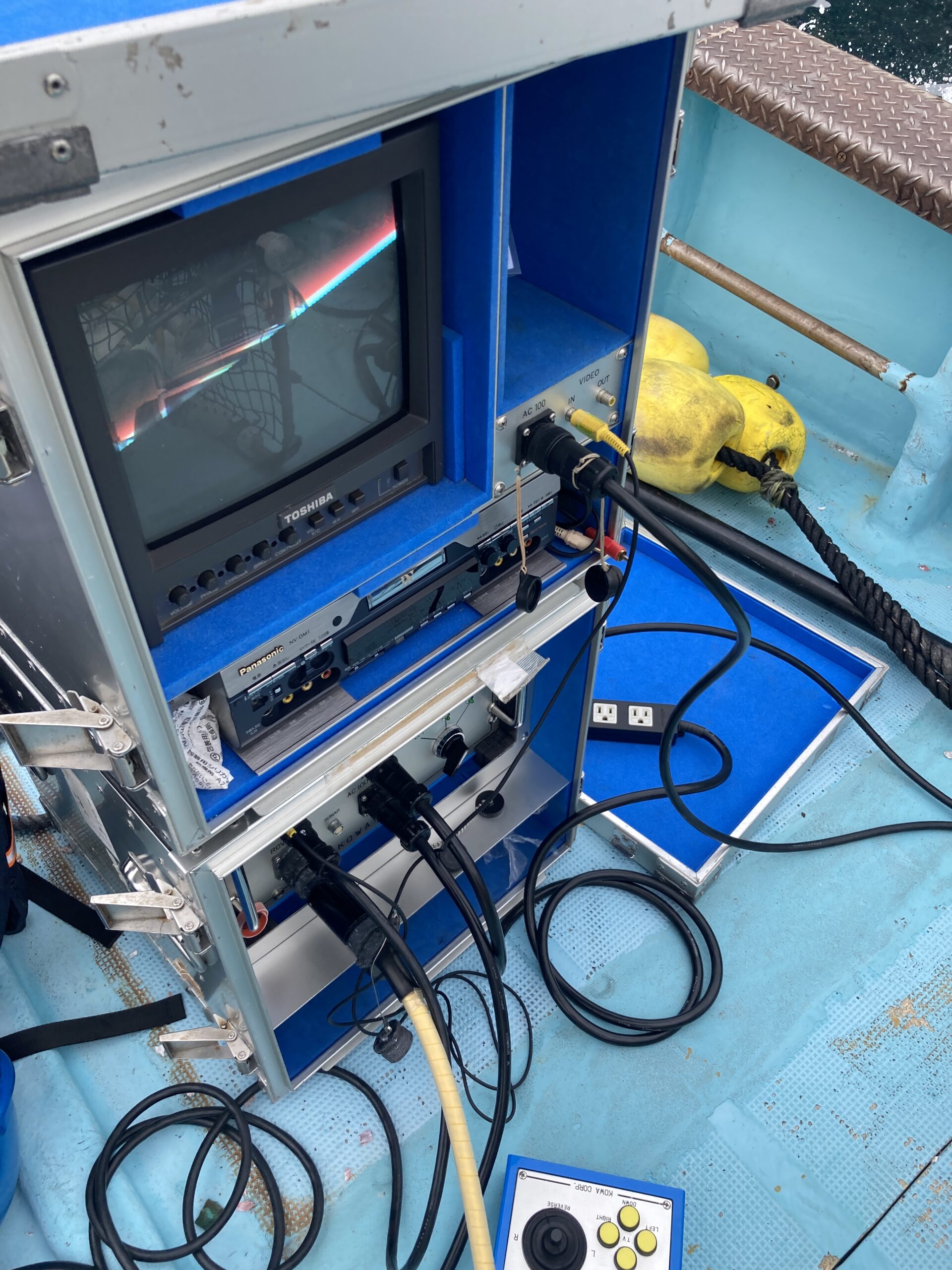 しかしそれ以上に大変なことは、揺れる船上で、別の動きをするROVのモニターを注視し、リモコンで操舵すること。