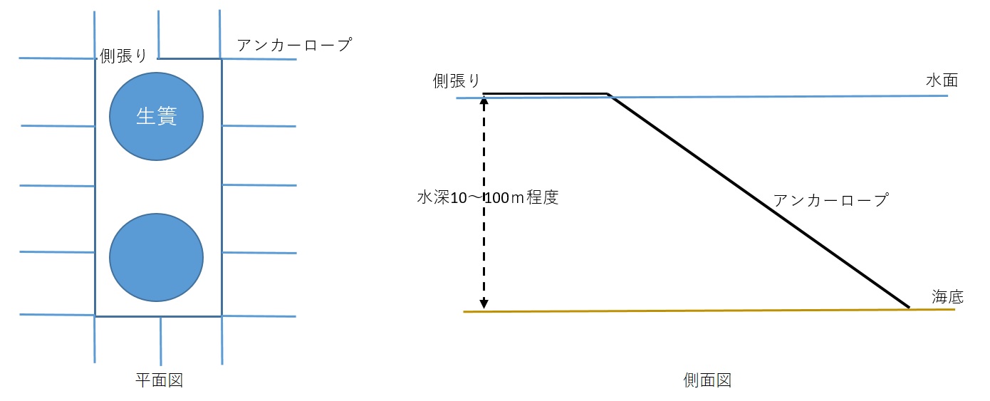 養殖網や定置網では、漁具をアンカーロープや側張りなどで固定しています。